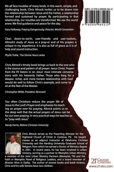 "Prayers from the Pit" listens in on Jesus' most intimate conversations with his heavenly Father. Those who long for a deeper, richer, and more honest relationship with God would do well to follow (Altrock's) example, and come to sit at the feet of the Master.--Christopher Webb, president, Renovar. 200 pp.
