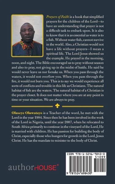 Prayers of Faith is a book that simplified prayers for the children of the Lord—to have an understanding that prayer is not a difficult task to embark upon. It is also to know that it is as essential as water is to a fish. Without water fish, cannot survive in the world. Also, a Christian would not have a life without prayers—I mean a spiritual life. The Lord Jesus showed us the example. He prayed in the morning, noon, and night. The Bible encouraged us to pray without season and also to pray, not giving up in the midst of battle. He said he would never leave us nor forsake us. When you pass through the waters, it would not overflow you. When you pass through the fire, it would not burn you. This is to say we would experience all sorts of conflicts and trouble in this life as Christians. The natural habitat of fish are the waters. The natural habitat of a Christian is the prayer closet. It does not matter where you are at any point in time or your situation. We are always to pray.