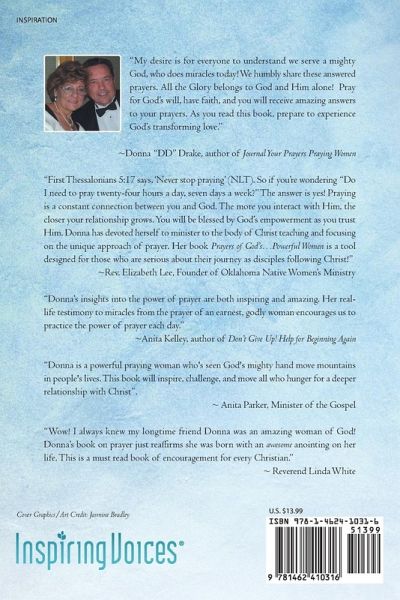 "My desire is for everyone to understand we serve a mighty God, who does miracles today! We humbly share these answered prayers. All the Glory belongs to God and Him alone! Pray for God's will, have faith, and you will receive amazing answers to your prayers. As you read this book, prepare to experience God's transforming love." ~Donna "DD" Drake, author of Journal Your Prayers Praying Women "First Thessalonians 5:17 says, 'Never stop praying' (NLT). So if you're wondering "Do I need to pray twenty-four hours a day, seven days a week?" The answer is yes! Praying is a constant connection between you and God. The more you interact with Him, the closer your relationship grows. You will be blessed by God's empowerment as you trust Him. Donna has devoted herself to minister to the body of Christ teaching and focusing on the unique approach of prayer. Her book Prayers of God's...Powerful Women is a tool designed for those who are serious about their journey as disciples following Christ!" ~Rev. Elizabeth Lee, Founder of Oklahoma Native Women's Ministry "Donna's insights into the power of prayer are both inspiring and amazing. Her real-life testimony to miracles from the prayer of an earnest, godly woman encourages us to practice the power of prayer each day." ~Anita Kelley, author of Don't Give Up! Help for Beginning Again "Donna is a powerful praying woman who's seen God's mighty hand move mountains in people's lives. This book will inspire, challenge, and move all who hunger for a deeper relationship with Christ". ~ Anita Parker, Minister of the Gospel "Wow! I always knew my longtime friend Donna was an amazing woman of God! Donna's book on prayer just reaffirms she was born with an awesome anointing on her life. This is a must read book of encouragement for every Christian." ~ Reverend Linda White