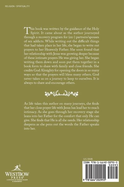 This book was written by the guidance of the Holy Spirit. It came about as the author journeyed through a recovery program for (ex-) partners/spouses of sex addicts. While writing out the difficult things that had taken place in her life, she began to write out prayers to her Heavenly Father. She soon found that her relationship with Jesus was growing deeper because of these intimate prayers He was giving her. She began writing them down and soon put them together in a book form to share with family and close friends. She credits God Almighty for opening the doors in so many ways so that the prayers will bless many others. God never takes us on a journey to keep to ourselves. It is always to share and encourage others.