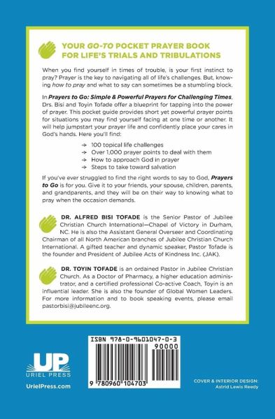 YOUR GO-TO POCKET PRAYER BOOK FOR LIFE'S TRIALS AND TRIBULATIONS When you find yourself in times of trouble, is your first instinct to pray? Prayer is the key to navigating all of life's challenges. But, knowing how to pray and what to say can sometimes be a stumbling block. In Prayers to Go: Simple & Powerful Prayers for Challenging Times, Drs. Bisi and Toyin Tofade offer a blueprint for tapping into the power of prayer. This pocket guide provides short yet powerful prayer points for situations you may find yourself facing at one time or another. It will help jumpstart your prayer life and confidently place your cares in God's hands. Here you'll find:100 topical life challenges Over 1,000 prayer points to deal with them How to approach God in prayer Steps to take toward salvation BONUS: 200 Bible verses to support each prayer topic -- the interactive eBook links directly to the Bible verses for your convenience If you've ever struggled to find the right words to say to God, Prayers to Go is for you. Give it to your friends, your spouse, children, parents, and grandparents, and they will be on their way to knowing what to pray when the occasion demands.