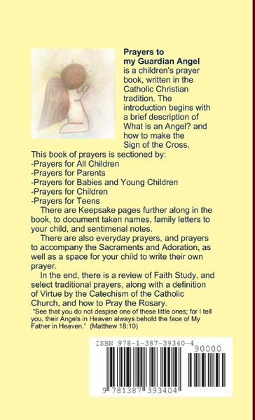 Prayers to my Guardian Angel is a children's prayer book, written in the Catholic Christian tradition. The introduction begins with a brief description of What is an Angel? and how to make the Sign of the Cross. This book of prayers is sectioned by: -Prayers for All Children -Prayers for Parents -Prayers for Babies and Young Children -Prayers for Children -Prayers for Teens There are Keepsake pages further along, to document taken names, letters to your child and sentimental notes. There are also prayers for everyday use, and prayers to accompany the Sacraments and Adoration, as well as a space for children to write a prayer of their own. In the end, is a review of Faith Study, selected traditional prayers, and definition of Virtue as by the Catechism of the Catholic Church, and how to pray the Rosary. "See that you do not despise one of these little ones; for I tell you, their Angels in Heaven always behold the face of My Father in Heaven." (Matthew 18:10)
