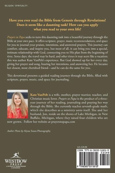 Have you ever read the Bible from Genesis through Revelations? Does it seem like a daunting task? How can you apply what you read to your own life? Prayers to Papa seeks to turn this daunting task into a beautiful journey through the Bible at your own pace. It offers scripture, prayer, music recommendations, and space for you to journal your praises, intentions, and answered prayers. This journey can comfort, educate, and inspire you, but most of all, it can bring you into a special, intimate relationship with God, connecting you to His plan from the beginning of time. Some days, the travel may be hard, and other times it may seem like a vacation; this was author Kate VanPelt's experience. But God showed up for her every day, giving her prayer and song, hearing her intentions, and answering her. He became her closest, most cherished friend-and he can do the same for you. This devotional presents a guided reading journey through the Bible, filled with scripture, prayer, music, and space for journaling.