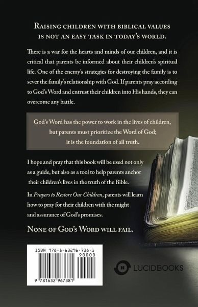 Raising children with biblical values is not an easy task in today's world. There is a war for the hearts and minds of our children, and it is critical that parents be informed about their children's spiritual life. One of the enemy's strategies for destroying the family is to sever the family's relationship with God. If parents pray according to God's Word and entrust their children into His hands, they can overcome any battle. God's Word has the power to work in the lives of children, but parents must prioritize the Word of God; it is the foundation of all truth. I hope and pray that this book will be used not only as a guide, but also as a tool to help parents anchor their children's lives in the truth of the Bible. In Prayers to Restore Our Children, parents will learn how to pray for their children with the might and assurance of God's promises. None of God's Word will fail.