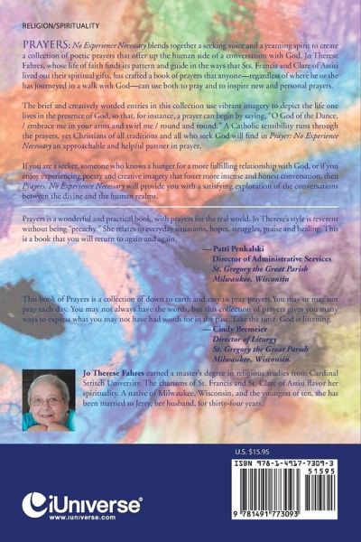 Prayers: No Experience Necessary blends together a seeking voice and a yearning spirit to create a collection of poetic prayers that offer up the human side of a conversation with God. Jo Therese Fahres, whose life of faith finds its pattern and guide in the ways that Sts. Francis and Clare of Assisi lived out their spiritual gifts, has crafted a book of prayers that anyone-regardless of where he or she has journeyed in a walk with God-can use both to pray and to inspire new and personal prayers. The brief and creatively worded entries in this collection use vibrant imagery to depict the life one lives in the presence of God, so that, for instance, a prayer can begin by saying, "O God of the Dance, / embrace me in your arms and twirl me / round and round." A Catholic sensibility runs through the prayers, yet Christians of all traditions and all who seek God will find in Prayer: No Experience Necessary an approachable and helpful partner in prayer. If you are a seeker, someone who knows a hunger for a more fulfilling relationship with God, or if you enjoy experiencing poetry and creative imagery that foster more intense and honest conversation, then Prayers: No Experience Necessary will provide you with a satisfying exploration of the conversations between the divine and the human realms.