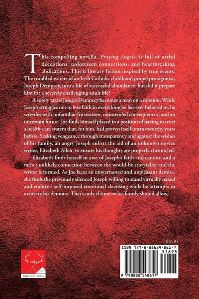 This compelling novella, Praying Angels, is full of artful deceptions, unforeseen connections, and heartbreaking abdications. This is literary fiction inspired by true events. The troubled waters of an Irish Catholic childhood propel protagonist, Joseph Dempsey, into a life of successful abundance, but did it prepare him for a severely challenging adult life? A sorely taxed Joseph Dempsey becomes a man on a mission. While Joseph struggles not to lose faith in everything he has ever believed in, he wrestles with unfamiliar frustration, unintended consequences, and an uncertain future. Joe finds himself placed in a position of having to trust a health-care system that, for him, had proven itself untrustworthy years before. Seeking vengeance through transparency and against the wishes of his family, an angry Joseph enlists the aid of an unknown novice writer, Elizabeth Allen, to ensure his thoughts are properly chronicled. Elizabeth finds herself in awe of Joseph's faith and candor, and a rather unlikely connection between the would-be storyteller and the writer is formed. As Joe faces an unwarranted and unpleasant demise, she finds the previously silenced Joseph willing to stand virtually naked and endure a self-imposed emotional cleansing while he attempts to excavate his demons. That's only if time or his family should allow.