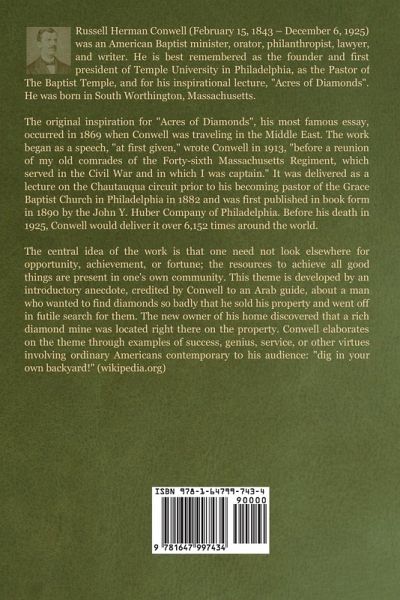 Russell Herman Conwell (February 15, 1843 – December 6, 1925) was an American Baptist minister, orator, philanthropist, lawyer, and writer. He is best remembered as the founder and first president of Temple University in Philadelphia, as the Pastor of The Baptist Temple, and for his inspirational lecture, "Acres of Diamonds". He was born in South Worthington, Massachusetts. The original inspiration for "Acres of Diamonds", his most famous essay, occurred in 1869 when Conwell was traveling in the Middle East. The work began as a speech, "at first given," wrote Conwell in 1913, "before a reunion of my old comrades of the Forty-sixth Massachusetts Regiment, which served in the Civil War and in which I was captain." It was delivered as a lecture on the Chautauqua circuit prior to his becoming pastor of the Grace Baptist Church in Philadelphia in 1882 and was first published in book form in 1890 by the John Y. Huber Company of Philadelphia. Before his death in 1925, Conwell would deliver it over 6,152 times around the world. The central idea of the work is that one need not look elsewhere for opportunity, achievement, or fortune; the resources to achieve all good things are present in one's own community. This theme is developed by an introductory anecdote, credited by Conwell to an Arab guide, about a man who wanted to find diamonds so badly that he sold his property and went off in futile search for them. The new owner of his home discovered that a rich diamond mine was located right there on the property. Conwell elaborates on the theme through examples of success, genius, service, or other virtues involving ordinary Americans contemporary to his audience: "dig in your own backyard!" (wikipedia.org)