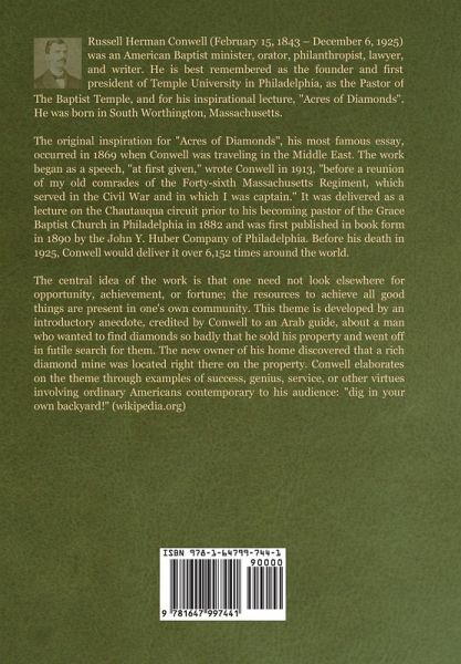 Russell Herman Conwell (February 15, 1843 - December 6, 1925) was an American Baptist minister, orator, philanthropist, lawyer, and writer. He is best remembered as the founder and first president of Temple University in Philadelphia, as the Pastor of The Baptist Temple, and for his inspirational lecture, "Acres of Diamonds". He was born in South Worthington, Massachusetts. The original inspiration for "Acres of Diamonds", his most famous essay, occurred in 1869 when Conwell was traveling in the Middle East. The work began as a speech, "at first given," wrote Conwell in 1913, "before a reunion of my old comrades of the Forty-sixth Massachusetts Regiment, which served in the Civil War and in which I was captain." It was delivered as a lecture on the Chautauqua circuit prior to his becoming pastor of the Grace Baptist Church in Philadelphia in 1882 and was first published in book form in 1890 by the John Y. Huber Company of Philadelphia. Before his death in 1925, Conwell would deliver it over 6,152 times around the world. The central idea of the work is that one need not look elsewhere for opportunity, achievement, or fortune; the resources to achieve all good things are present in one's own community. This theme is developed by an introductory anecdote, credited by Conwell to an Arab guide, about a man who wanted to find diamonds so badly that he sold his property and went off in futile search for them. The new owner of his home discovered that a rich diamond mine was located right there on the property. Conwell elaborates on the theme through examples of success, genius, service, or other virtues involving ordinary Americans contemporary to his audience: "dig in your own backyard!" (wikipedia.org)