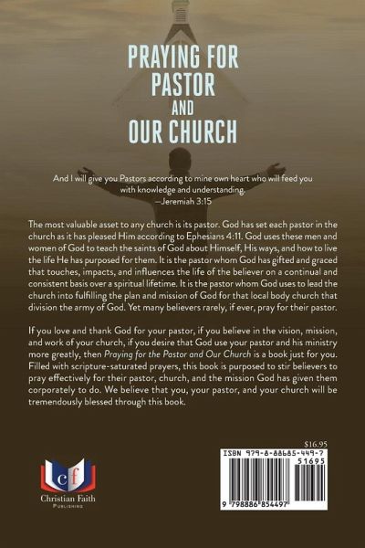 And I will give you Pastors according to mine own heart who will feed you with knowledge and understanding. --Jeremiah 3:15 The most valuable asset to any church is its pastor. God has set each pastor in the church as it has pleased Him according to Ephesians 4:11. God uses these men and women of God to teach the saints of God about Himself, His ways, and how to live the life He has purposed for them. It is the pastor whom God has gifted and graced that touches, impacts, and influences the life of the believer on a continual and consistent basis over a spiritual lifetime. It is the pastor whom God uses to lead the church into fulfilling the plan and mission of God for that local body church that divides the army of God. Yet many believers rarely, if ever, pray for their pastor. If you love and thank God for your pastor, if you believe in the vision, mission, and work of your church, if you desire that God use your pastor and his ministry more greatly, then Praying for the Pastor and Our Church is a book just for you. Filled with scripture-saturated prayers, this book is purposed to stir believers to pray effectively for their pastor, church, and the mission God has given them corporately to do. We believe that you, your pastor, and your church will be tremendously blessed through this book.