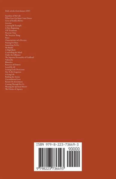 Daily articles from January 2010 Sunshine of My Life What Goes Up Must Come Down Giver of Endless Riches Gravitas Learning By Example A New Beginning VIP Treatment Precious Time The Sweetest Thing Putra Characteristics of a Devotee Praying For Rain Something To Do My Buddy A High Birth Controlling the Mind Under the Influence The Supreme Personality of Godhead Vaikuntha Blameless Remover of Distress Loved By All Seeking God's Protection Not To Be Forgotten A Long Life Battling the Asuras Unconditional Love Return On Investment Coming Through For Us Pleasing the Spiritual Master The Glories of Agastya