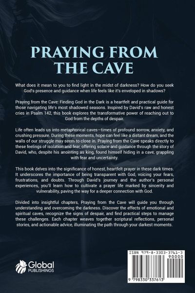 What does it mean to you to find light in the midst of darkness? How do you seek God's presence and guidance when life feels like it's enveloped in shadows? Praying from the Cave: Finding God in the Dark is a heartfelt and practical guide for those navigating life's most shadowed seasons. Inspired by David's raw and honest cries in Psalm 142, this book explores the transformative power of reaching out to God from the depths of despair. ¿ Life often leads us into metaphorical caves-times of profound sorrow, anxiety, and crushing pressure. During these moments, hope can feel like a distant dream, and the walls of our struggle may seem to close in. Praying from the Cave speaks directly to these feelings of isolation and fear, offering solace and guidance through the story of David, who, despite his anointing as king, found himself hiding in a cave, grappling with fear and uncertainty. ¿ This book delves into the significance of honest, heartfelt prayer in these dark times. It underscores the importance of being transparent with God, voicing your fears, frustrations, and doubts. Through David's journey and the author's personal experiences, you'll learn how to cultivate a prayer life marked by sincerity and vulnerability, paving the way for a deeper connection with God. Divided into insightful chapters, Praying from the Cave will guide you through understanding and overcoming the darkness. Discover the effects of emotional and spiritual caves, recognize the signs of despair, and find practical steps to manage these challenges. Each chapter weaves together scriptural reflections, personal stories, and actionable advice, illuminating the path through your darkest moments.