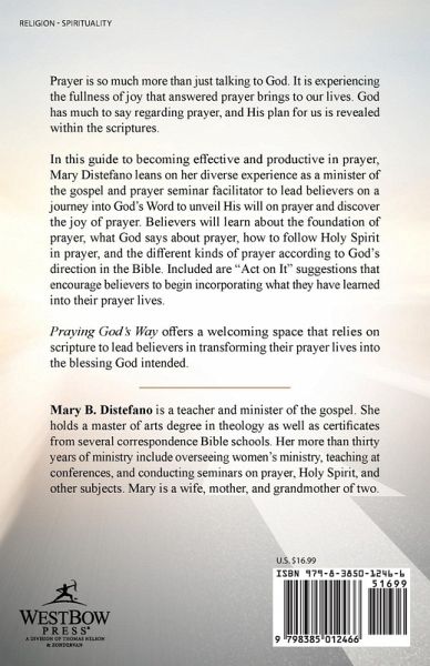 Prayer is so much more than just talking to God. It is experiencing the fullness of joy that answered prayer brings to our lives. God has much to say regarding prayer, and His plan for us is revealed within the scriptures. In this guide to becoming effective and productive in prayer, Mary Distefano leans on her diverse experience as a minister of the gospel and prayer seminar facilitator to lead believers on a journey into God's Word to unveil His will on prayer and discover the joy of prayer. Believers will learn about the foundation of prayer, what God says about prayer, how to follow Holy Spirit in prayer, and the different kinds of prayer according to God's direction in the Bible. Included are "Act on It" suggestions that encourage believers to begin incorporating what they have learned into their prayer lives. Praying God's Way offers a welcoming space that relies on scripture to lead believers in transforming their prayer lives into the blessing God intended.