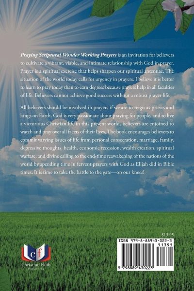 Praying Scriptural Wonder--Working Prayers is an invitation for believers to cultivate a vibrant, viable, and intimate relationship with God in prayer. Prayer is a spiritual exercise that helps sharpen our spiritual antennae. The situation of the world today calls for urgency in prayers. I believe it is better to learn to pray today than to earn degrees because prayers help in all faculties of life. Believers cannot achieve good success without a robust prayer life. All believers should be involved in prayers if we are to reign as priests and kings on Earth. God is very passionate about praying for people, and to live a victorious Christian life in this present world, believers are enjoined to watch and pray over all facets of their lives. The book encourages believers to commit varying issues of life from personal consecration, marriage, family, depressive thoughts, health, economic recession, wealth creation, spiritual warfare, and divine calling to the end-time reawakening of the nations of the world by spending time in fervent prayers with God as Elijah did in Bible times. It is time to take the battle to the gate--on our knees!