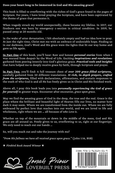 ¿ Award-Winning Book ¿ Does your heart long to be immersed in God and His amazing grace? This book is filled to overflowing with the riches of God's grace found in the pages of Scripture. For years, I have loved praying the Scripture, and have been captivated by the theme of grace that permeates it. When tragedy struck my world unexpectedly, these became my lifeline. In 2017, our firstborn son was born by emergency c-section in critical condition. In 2019, he passed away at 20 months old. In the wake of utter devastation, I felt absolutely empty and had no idea how to pray. At just the right time, Christ met me with an embrace of undeniable hope. Finding us in our darkness, God's Word and His grace were the lights that lit our way home and gave us life again. In Part One of this book, you'll hear: Raw and honest personal stories from when I was rescued from despair by the Word of Life. Exciting inspirations and revelations gathered from peering intently into God's glorious grace. Practical tools and insights that have helped me to deeply receive grace by faith, through Scripture and prayer. In Part Two, you'll find: A full treasure chest of over 200 grace-filled scriptures, carefully gathered from 20 different translations. 31 rich, in-depth prayers, crafted from the scriptures, filled with declarations, affirmations, and ecstatic responses to the truth of who God is and all He has freely given us in Christ and His finished work. Above all, I pray this book leads you into personally experiencing the God of grace for yourself in greater and greater ways. Encounter after encounter, grace upon grace. May we find the amazing grace of God in the deep, the true and the real. Grace is the place where the brilliant and beautiful light of Heaven fills our lives, no matter how dark it may seem. Where we are transformed from the inside out. Where we are fully embraced by perfect love that reaches into our world, and we are loved to life and wholeness, right where we are ... all because of who Love is. Whether on top of the mountain or down in the middle of the mess, God and His grace are all around us. Freely given to us, overflowing to us, right at our fingertips. We only need to reach out our hands ... So, will you reach out and take the journey with me? "From His fullness we have all received grace upon grace." (John 1:16, BSB)