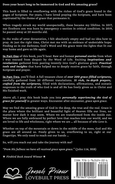 ¿ Award-Winning Book ¿ Does your heart long to be immersed in God and His amazing grace? This book is filled to overflowing with the riches of God's grace found in the pages of Scripture. For years, I have loved praying the Scripture, and have been captivated by the theme of grace that permeates it. When tragedy struck my world unexpectedly, these became my lifeline. In 2017, our firstborn son was born by emergency c-section in critical condition. In 2019, he passed away at 20 months old. In the wake of utter devastation, I felt absolutely empty and had no idea how to pray. At just the right time, Christ met me with an embrace of undeniable hope. Finding us in our darkness, God's Word and His grace were the lights that lit our way home and gave us life again. In Part One of this book, you'll hear: Raw and honest personal stories from when I was rescued from despair by the Word of Life. Exciting inspirations and revelations gathered from peering intently into God's glorious grace. Practical tools and insights that have helped me to deeply receive grace by faith, through Scripture and prayer. In Part Two, you'll find: A full treasure chest of over 200 grace-filled scriptures, carefully gathered from 20 different translations. 31 rich, in-depth prayers, crafted from the scriptures, filled with declarations, affirmations, and ecstatic responses to the truth of who God is and all He has freely given us in Christ and His finished work. Above all, I pray this book leads you into personally experiencing the God of grace for yourself in greater and greater ways. Encounter after encounter, grace upon grace. May we find the amazing grace of God in the deep, the true and the real. Grace is the place where the brilliant and beautiful light of Heaven fills our lives, no matter how dark it may seem. Where we are transformed from the inside out. Where we are fully embraced by perfect love that reaches into our world, and we are loved to life and wholeness, right where we are ... all because of who Love is. Whether on top of the mountain or down in the middle of the mess, God and His grace are all around us. Freely given to us, overflowing to us, right at our fingertips. We only need to reach out our hands ... So, will you reach out and take the journey with me? "From His fullness we have all received grace upon grace." (John 1:16, BSB)