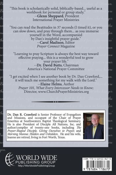 "This book is Scholastically Solid, biblically-based... useful as a workbook for personal or group study." --Glen Sheppard, President International Prayer Ministries "You can read the Beatitudes in 37 seconds (I timed it), or you can slow down, and pray through them... as you immerse yourself in the Word, accompanied by Dan's insightful prayer guide." --Carol Madison, Editor Prayer Connect Magazine "Learning to pray Scripture is always the best way toward effective praying... this is a wonderful tool to grow your life." --Dr. David Butts, Chairman America's National Prayer Committee "I get excited when I see another book by Dr. Dan Crawford,... it will teach me something for my walk with the Lord." --Elaine Helms, Author, Director www.ChurchPrayerMinistries.org