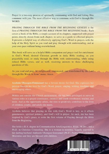PRAYING THROUGH THE BIBLE FROM THE BEGINNING GENESIS is the first of PRAYING THROUGH THE BIBLE FROM THE BEGINNING books. Each covers a book of the Bible; a simple account of its chapters, supported with prayer points directly drawn from each chapter, to serve as a guide to effectual prayers. It presents a helpful way of effectively applying God's Word in prayers by the help of the Holy Spirit as you read and pray through with understanding, and at your own pace without being overwhelmed. Prayer is a two-way process of spiritually communing with God and letting Him commune with you. The most effective way to commune with God is through His WORD. This book will serve as a helpful Bible companion and prayer tool for enrichment in God's Word; desired Christian growth in daily Bible reading, by prayerfully reading, or studying through the Bible with understanding, in line with God's Word, while using related Bible verses, and as well, receiving answers to those challenging questions of life. As you read and pray, be enlightened, empowered, and transformed by the Lord through His Word, in Jesus' name. Amen.