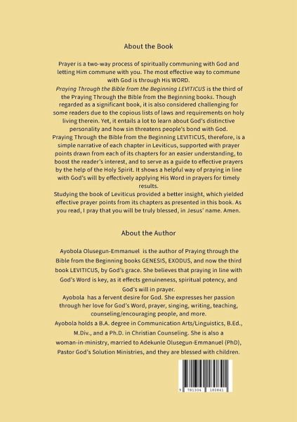 Prayer is a two-way process of spiritually communing with God and letting Him commune with you. The most effective way to commune with God is through His WORD. Praying Through the Bible from the Beginning LEVITICUS is the third of the Praying Through the Bible from the Beginning book. Though regarded as a significant book, it is also considered challenging for some readers due to the copious lists of laws and requirements on holy living therein. Yet, it entails a lot to learn about God's distinctive personality and how sin threatens people's bond with God. Praying Through the Bible from the Beginning LEVITICUS, therefore, is a simple narrative of each chapter in Leviticus, supported with prayer points drawn from each of its chapters for an easier understanding, to boost the reader's interest, and to serve as a guide to effective prayers by the help of the Holy Spirit. It shows a helpful way of praying in line with God's will by effectively applying His Word in prayers for timely results. Studying the book of Leviticus provided a better insight, which yielded effective prayer points from its chapters as presented in this book. As you read, I pray that you will be truly blessed, in Jesus' name. Amen.