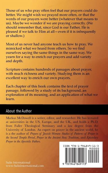 This book taught me more about prayer and grew my prayer life more than any single resource I have found. Janet Severson (London) A unique study and devotional book on prayer-McDowell's knowledge of the prayers and ability to apply them to the practice of prayer is unparalleled. Jonathan Schneider (Tampa) Those of us who pray often feel that our prayers could do better. We might wish we prayed more often, or that the words of our prayers were better (whatever that means to us). Maybe we wonder if we are praying correctly. (We should remember that, since God is our Father, He is pleased if we talk to Him at all-even if it is infrequently or shallow.) Most of us never had anyone teach us how to pray. We mimicked what we heard from others. So we find ourselves saying the same things in the same way. We yearn for a way to enrich our prayers and add variety and depth. This book can help. Scripture contains hundreds of passages about prayer, with much richness and variety. Studying them is an excellent way to enrich our own prayers. This volume contains a chapter for each of the 40+ prayers in Genesis through Joshua. Each chapter includes the text of prayer passage, followed by a study of its background, an exploration of its meaning, and an application of what we learn. The introduction includes an exploration of studying the Bible and an overview of every type of prayer: praise, thanksgiving, petition, intercession, vow, confession, repentance, lament, blessing, and curse. Well-suited for either personal or group study and devotional.