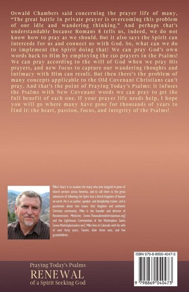 Oswald Chambers said concerning the prayer life of many, "The great battle in private prayer is overcoming this problem of our idle and wandering thinking." And perhaps that's understandable because Romans 8 tells us, indeed, we do not know how to pray as we should. But it also says the Spirit can intercede for us and connect us with God. How can we do to implement the Spirit doing that? We can pray God's own words back to Him by employing the 150 prayers in the Psalms! We can pray according to the will of God when we pray His prayers, and new focus to capture our wandering thoughts and intimacy with Him can result. But then there's the problem of many concepts applicable to the Old Covenant Christians can't pray. And that's the point of Praying Today's Psalms: it infuses the Psalms with New Covenant words we can pray to get the full benefit of each one. If your prayer life needs help, I hope you will go where many have gone for thousands of years to find it: the heart, passion, focus, and integrity of the Psalms!