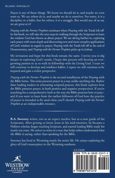 Prayer is one of those things. We know we should do it, and maybe we even want to. We see others do it, and maybe we do it ourselves. For some, it is a discipline or a habit, but for others, it is a struggle. But would any of us say we are great at it? Praying with the Former Prophets continues where Praying with the Torah left off. In this book, we will take the next steps in walking through the Scriptures to learn the wisdom God has shown us about prayer. We are diving further in, exploring each prayer with more depth and discovering new and more complex applications of God's wisdom in regard to prayer. Praying with the Torah left off at the end of Deuteronomy, and Praying with the Former Prophets picks up in Joshua. My invitation and hope for this book remain the same. I invite you to dig deeper in exploring God's words. I hope this process will develop an ever-growing passion in us to walk in fellowship with the Living God. I trust we will continue to develop and reinforce habits. I expect we will continue to be inspired and gain a richer perspective. Praying with the Former Prophets is the second installment of the Praying with the Bible Series. This series presents prayer in a way unlike anything else. Rather than leading readers in reiterating scripted prayers, this book explores how the Bible presents prayer, in both positive and negative perspectives. If you're searching for a comprehensive look at the way the Bible presents how to pray- and if you want to learn from the earliest followers of God how the practice of prayer is intended to be used-then you'll cherish Praying with the Former Prophets as an indispensable resource.