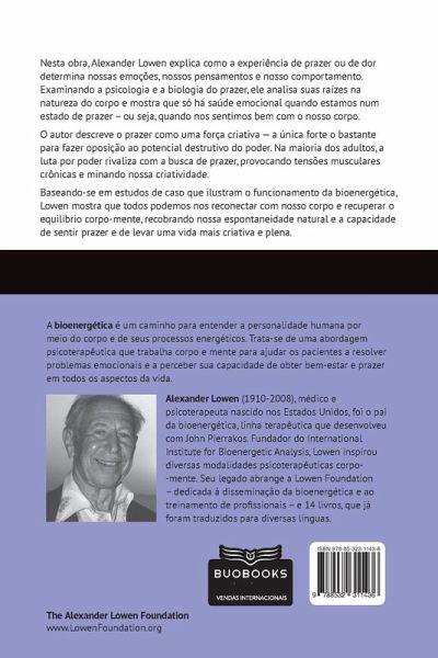 Nesta obra, Alexander Lowen explica como a experiência de prazer ou de dor determina nossas emoções, nossos pensamentos e nosso comportamento. Examinando a psicologia e a biologia do prazer, ele analisa suas raízes na natureza do corpo e mostra que só há saúde emocional quando estamos num estado de prazer ¿ ou seja, quando nos sentimos bem com o nosso corpo. O autor descreve o prazer como uma força criativa ¿ a única forte o bastante para fazer oposição ao potencial destrutivo do poder. Na maioria dos adultos, a luta por poder rivaliza com a busca de prazer, provocando tensões musculares crônicas e minando nossa criatividade. Baseando-se em estudos de caso que ilustram o funcionamento da bioenergética, Lowen mostra que todos podemos nos reconectar com nosso corpo e recuperar o equilíbrio corpo-mente, recobrando nossa espontaneidade natural e a capacidade de sentir prazer e de levar uma vida mais criativa e plena.