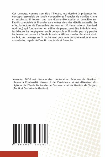 Cet ouvrage, comme son titre l'illustre, est destiné à présenter les concepts essentiels de l'audit comptable et financier de manière claire et succincte. Il fournit une vue d'ensemble rapide et complète sur l'audit comptable et financier sans entrer dans des détails excessifs. En effet, la lecture, de l'ensemble des normes ISA (International Standard Auditing) qui font environ un millier de pages, peut être intimidante et fastidieuse. Le néophyte en audit comptable et financier peut s'y perdre facilement et passer à côté de la substantifique moelle. En allant droit au but, cet ouvrage se lit facilement pour une compréhension et une assimilation rapide de l'audit comptable et financier.