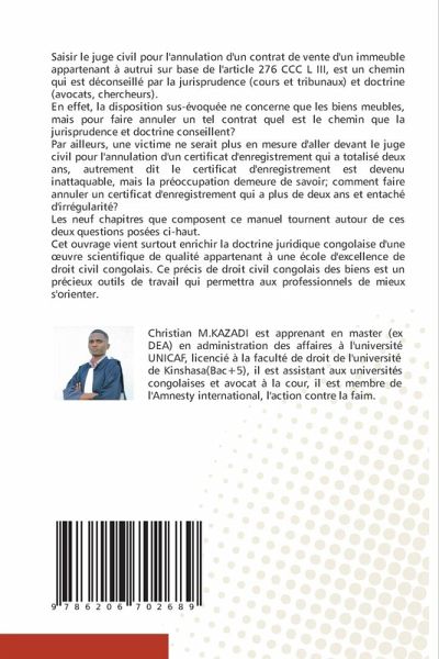 Saisir le juge civil pour l'annulation d'un contrat de vente d'un immeuble appartenant à autrui sur base de l'article 276 CCC L III, est un chemin qui est déconseillé par la jurisprudence (cours et tribunaux) et doctrine (avocats, chercheurs).En effet, la disposition sus-évoquée ne concerne que les biens meubles, mais pour faire annuler un tel contrat quel est le chemin que la jurisprudence et doctrine conseillent?Par ailleurs, une victime ne serait plus en mesure d'aller devant le juge civil pour l'annulation d'un certificat d'enregistrement qui a totalisé deux ans, autrement dit le certificat d'enregistrement est devenu inattaquable, mais la préoccupation demeure de savoir; comment faire annuler un certificat d'enregistrement qui a plus de deux ans et entaché d'irrégularité?Les neuf chapitres que composent ce manuel tournent autour de ces deux questions posées ci-haut.Cet ouvrage vient surtout enrichir la doctrine juridique congolaise d'une oeuvre scientifique de qualité appartenant à une école d'excellence de droit civil congolais. Ce précis de droit civil congolais des biens est un précieux outils de travail qui permettra aux professionnels de mieux s'orienter.