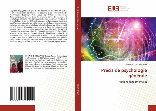 Ce précis de psychologie générale est destiné aux étudiants en gestion et en administration des institutions scolaires et de formation (GAISF) de l'Institut Supérieur Pédagogique de Watsa en République Démocratique du Congo. Dans la première partie de ce précis de psychologie générale, l'étudiant apprendra non seulement l'histoire de la psychologie et de ses différents courants philosophiques, mais aussi les différentes méthodes de recherche en psychologie. De manière non exclusive, ce précis de psychologie générale aborde les thèmes relatifs aux mécanismes biologiques qui sont à la base de comportements humains, avec une attention particulière aux principales facultés de l'homme : la perception (chap.2), l'apprentissage (chap.3), la mémoire (chap.4), le langage et l'image (chap.5), l'intelligence (chap.6), la motivation, l'émotion et la personnalité (chap.7). La dernière partie de ce précis est une introduction à la psychopathologie, aux grandes catégories de pathologies mentales (chap.8) ainsi qu'à des applications de la psychologie dans les domaines économique et politique (chap.9).