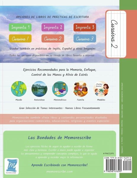 TITULO: Aprende Escribiendo. Prácticas de Escritura Manuscrita, a Mano. TEMA: Oración Padre Nuestro. DETALLE: Letra Cursiva - Nivel 2 - Español - 38 Pages - 8,5 pulgadas x 11 pulgadas. MEMORESCRIBE #: PNCC2PS Prácticas para desarrollar un estilo personal y único de escritura a mano (Manuscrita) con ejercicios fáciles de seguir mientras aprenden y revisan la Oración Padre Nuestro con divertidas actividades de descanso. 1. * Ejercicios integrales para la memoria, atención, control de las manos y alivio del estrés. * Seleccione un libro de ejercicios de acuerdo con su habilidad (no la edad) y luego puede escoger otro para mayor habilidad a medida que va mejorando. * Valiosa herramienta para actividades como Soporte de Programas Educativos en las escuelas, Tareas para Educación en el hogar, o solo para estar ocupado durante un viaje. * Recomendado y usado como Herramienta de Reaprendizaje de Escritura a Mano. * Varias investigaciones dicen que trabajar activamente el Sistema Motor de las Manos escribiendo tiene un efecto positivo en la memoria y el aprendizaje. Recordamos mejor cuando aprendemos mediante repetición. Elija entre libros de letra imprenta y en cursiva. También. elija entre los libros de tamaños de texto nivel 1, nivel 2 o nivel 3 en el estilo seleccionado. Libros disponibles en inglés, español y otros idiomas. Los creadores de Memorescribe han estado envueltos y soportando Misiones Cristianas y Humanitarias en varios países con énfasis en la educación. Los libros de ejercicios "Memorescribe Aprende Escribiendo" pueden ser personalizados de acuerdo con las necesidades o requerimientos especiales de organizaciones interesadas. Para más información visite nuestro sitio de internet www.memorescribe.com. TITLE: Learn by Handwriting, Practice Workbook THEME: The Lord's Prayer DETAIL: Cursive - Level 2 - Spanish - 38 Pages - 8.5 inch x 11 inch. MEMORESCRIBE: PNCC2PS Writers will enjoy practicing and developing their personal, unique handwriting style with easy-to-follow exercises while they learn and review The Lord's Prayer. 2. * Comprehensive exercises for memory, focus, hand control, and stress relief. * Valuable tools for activities such as school curriculum support and homework, homeschooling activity, practice Spanish, or just staying busy on a trip. * Valuable tools in Second Language education programs. With Memorescribe, choose a handwriting style and text size. Choose between books in print and cursive. For handwriting text size, choose from books level 1, level 2, or level 3 (instead of age) in your selected style. Books available in English, Spanish, and other languages. More information at Memorescribe.com.