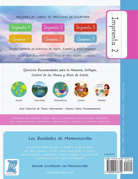 TITULO: Aprende Escribiendo. Prácticas de Escritura Manuscrita, a Mano. TEMA: Oración Padre Nuestro. DETALLE: Letra Imprenta - Nivel 2 - Español - 38 Pages - 8,5 pulgadas x 11 pulgadas. MEMORESCRIBE #: PNCP2PS Prácticas para desarrollar un estilo personal y único de escritura a mano (Manuscrita) con ejercicios fáciles de seguir mientras aprenden y revisan la Oración Padre Nuestro con divertidas actividades de descanso. 1. * Ejercicios integrales para la memoria, atención, control de las manos y alivio del estrés. * Seleccione un libro de ejercicios de acuerdo con su habilidad (no la edad) y luego puede escoger otro para mayor habilidad a medida que va mejorando. * Valiosa herramienta para actividades como Soporte de Programas Educativos en las escuelas, Tareas para Educación en el hogar, o solo para estar ocupado durante un viaje. * Recomendado y usado como Herramienta de Reaprendizaje de Escritura a Mano. * Varias investigaciones dicen que trabajar activamente el Sistema Motor de las Manos escribiendo tiene un efecto positivo en la memoria y el aprendizaje. Recordamos mejor cuando aprendemos mediante repetición. Elija entre libros de letra imprenta y en cursiva. También. elija entre los libros de tamaños de texto nivel 1, nivel 2 o nivel 3 en el estilo seleccionado. Libros disponibles en inglés, español y otros idiomas. Los creadores de Memorescribe han estado envueltos y soportando Misiones Cristianas y Humanitarias en varios países con énfasis en la educación. Los libros de ejercicios "Memorescribe Aprende Escribiendo" pueden ser personalizados de acuerdo con las necesidades o requerimientos especiales de organizaciones interesadas. Para más información visite nuestro sitio de internet www.memorescribe.com. TITLE: Learn by Handwriting, Practice Workbook THEME: The Lord's Prayer DETAIL: Print - Level 2 - Spanish - 38 Pages - 8.5 inch x 11 inch. MEMORESCRIBE: PNCP2PS Writers will enjoy practicing and developing their personal, unique handwriting style with easy-to-follow exercises while they learn and review The Lord's Prayer. 2. * Comprehensive exercises for memory, focus, hand control, and stress relief. * Valuable tools for activities such as school curriculum support and homework, homeschooling activity, practice Spanish, or just staying busy on a trip. * Valuable tools in Second Language education programs. With Memorescribe, choose a handwriting style and text size. Choose between books in print and cursive. For handwriting text size, choose from books level 1, level 2, or level 3 (instead of age) in your selected style. Books available in English, Spanish, and other languages. More information at Memorescribe.com.