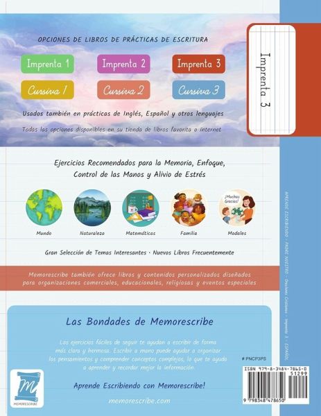 TITULO: Aprende Escribiendo. Prácticas de Escritura Manuscrita, a Mano. TEMA: Oración Padre Nuestro. DETALLE: Letra Imprenta - Nivel 3 - Español - 36 Pages - 8,5 pulgadas x 11 pulgadas. MEMORESCRIBE #: PNCP3PS Prácticas para desarrollar un estilo personal y único de escritura a mano (Manuscrita) con ejercicios fáciles de seguir mientras aprenden y revisan la Oración Padre Nuestro con divertidas actividades de descanso. 1. * Ejercicios integrales para la memoria, atención, control de las manos y alivio del estrés. * Seleccione un libro de ejercicios de acuerdo con su habilidad (no la edad) y luego puede escoger otro para mayor habilidad a medida que va mejorando. * Valiosa herramienta para actividades como Soporte de Programas Educativos en las escuelas, Tareas para Educación en el hogar, o solo para estar ocupado durante un viaje. * Recomendado y usado como Herramienta de Reaprendizaje de Escritura a Mano. * Varias investigaciones dicen que trabajar activamente el Sistema Motor de las Manos escribiendo tiene un efecto positivo en la memoria y el aprendizaje. Recordamos mejor cuando aprendemos mediante repetición. Elija entre libros de letra imprenta y en cursiva. También. elija entre los libros de tamaños de texto nivel 1, nivel 2 o nivel 3 en el estilo seleccionado. Libros disponibles en inglés, español y otros idiomas. Los creadores de Memorescribe han estado envueltos y soportando Misiones Cristianas y Humanitarias en varios países con énfasis en la educación. Los libros de ejercicios "Memorescribe Aprende Escribiendo" pueden ser personalizados de acuerdo con las necesidades o requerimientos especiales de organizaciones interesadas. Para más información visite nuestro sitio de internet www.memorescribe.com. TITLE: Learn by Handwriting, Practice Workbook THEME: The Lord's Prayer DETAIL: Print - Level 3 - Spanish - 36 Pages - 8.5 inch x 11 inch. MEMORESCRIBE: PNCP3PS Writers will enjoy practicing and developing their personal, unique handwriting style with easy-to-follow exercises while they learn and review The Lord's Prayer. 2. * Comprehensive exercises for memory, focus, hand control, and stress relief. * Valuable tools for activities such as school curriculum support and homework, homeschooling activity, practice Spanish, or just staying busy on a trip. * Valuable tools in Second Language education programs. With Memorescribe, choose a handwriting style and text size. Choose between books in print and cursive. For handwriting text size, choose from books level 1, level 2, or level 3 (instead of age) in your selected style. Books available in English, Spanish, and other languages. More information at Memorescribe.com.
