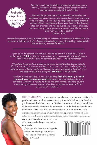 Descubra un enfoque de pérdida de peso completamente nuevo con lecturas y actividades diarias simples y fáciles de seguir dentro de este devocional y estudio bíblico de 21 días. Descubra los patrones que la han mantenido abrumada y con sobrepeso, además de cómo romper esos bastiones. Termine su ansias junto con cualquier ciclo de culpa y vergüenza aplicando poderosas verdades bíblicas para liberarse de por vida. Decenas de miles como usted han terminado una vida de frustración por comer en exceso, tener atracones y antojos que antes se sentían imposibles de superar, pero "Con Dios todo es posible". (Mateo 19:26) La verdad es que Dios la ama, la quiere libre y no cautiva de sus emociones o apetito. Él la creó para estar saludable por diseño. ¡Experimente más alegría, paz y libertad hoy, ¡adoptando la Pérdida de Peso, a la Manera de Dios! "T"¡Este es un devocionario asombroso! Acabo de terminar el plan de 21 días y ya he perdido 6 kilos. ¡Esta no es una dieta, es un estilo de vida! Aprendí mucho sobre el plan de Dios para mi salud y bienestar ". -Angela Richardson "He estado luchando [mis problemas de peso] o aceptándolos durante más de 30 años. He hecho yo-yo con una dieta o truco tras otro. Nada me ha ayudado a bajar de peso. El Señor me llevó a "Pérdida de peso, a la manera de Dios", ¡y un año después del día en que perdí 50 kilos! " -Marilyn Wehrli "Disfruté usando este libro. Es muy fácil de leer, fácil de seguir y es fácil convertirlo en un elemento básico permanente en mi deseo de estar saludable. Acercarse a nuestro Padre es una gran ventaja. Este libro es para cualquiera que quiera acercarse más a Dios y cambiar su salud de forma permanente". -Michelle A