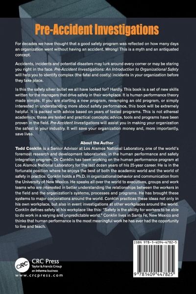 'The concepts outlined in this absorbing book are eminently practical and have been tested in the field. Pre-Accident Investigations might well not only enhance safety but save organizations money - and potentially lives too.' The RoSPA Occupational Safety & Health Journal, December 2012 'Conklin slaughters many holy cows in this very readable book, including the notion of cause?, which he rejects as simply a retrospective construct. Workers don't cause failure; what workers do is trigger a whole lot of weaknesses that exist in environments, processes, systems, job sites, and in the work or organization itself.? Conklin's ideas are persuasive, challenging, crystal clear, and expressed with humility and acknowledgement of what he has learned from others.' Safeguard, July/August 2013 'In this book, Dr Todd Conklin provides a welcome insight into the state of play of contemporary workplace health and safety practice in America as well as some down-to-earth advice on work health and safety risk management. The author's use of case studies, workplace examples and a conversational tone to describe safety failures and successes makes reading the book an easy and quick exercise.' Australian & New Zealand Journal of Health, Safety and Environment, vol. 28, no. 3