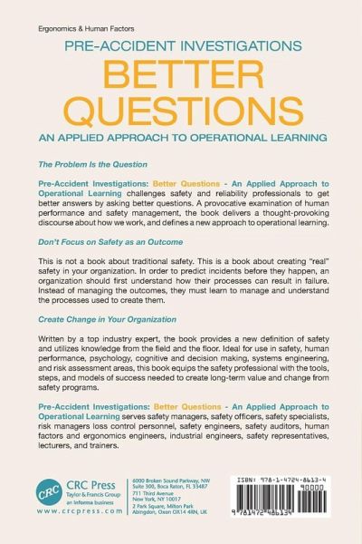 Pre-Accident Investigations: Better Questions - An Applied Approach to Operational Learning challenges safety and reliability professionals to get better answers by asking better questions. A provocative examination of human performance and safety management, the book delivers a thought-provoking discourse about how we work, and defines a new approach to operational learning.