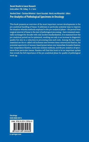 This book presents an overview of the most important current developments in the pre-analytical handling of tissue. It addresses in particular potential ways to improve the situation whereby methods employed in the pre-analytical phase - the period from surgical removal of tissue to the start of pathological processing - have remained essentially unchanged for decades with only modest standardization. It is examined how the pre-analytical period can be optimized, resulting not only in an increase in diagnostic quality but also in a reduction in processing time and costs. Among the key topics examined are the so-called cold ischemia time between tissue removal and fixation, the potential superiority of vacuum-based preservation over immediate formalin fixation, two-temperature fixation, molecular analysis methods, and the pre-analytics of specimens from particular tissues. Readers will find this book to be an important update that reveals the full importance of the pre-analytical phase for quality of pathological work-up.