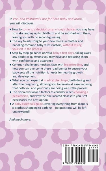 Stop doubting and start knowing. Motherhood isn't as scary as you may think… Are you an expectant mother who gets anxious every time you imagine life once the baby arrives, doubting if you'll live up to the standards to keep another human being alive? Is this your first, second, or even fifth pregnancy, yet you feel as if you need a thorough refresher once more before going into the process? Do you constantly worry that you won't be prepared for when the baby enters the world, feeling as if you're bound to make a mistake? One that may even harm the baby? It's completely natural for first-time mothers to feel overwhelmed and scared when expecting. Although the majority of women experience the beauties of pregnancy and childbirth, it doesn't mean it gets any less daunting when the next one arrives. The main reason why women stress so much about their pregnancies though, is because of their lack of knowledge concerning the baby itself. It's one thing to understand the changes your body goes through throughout the process, but once the baby is born, there's a whole other focus. For that reason, it can only work in your favor to delve into the topics covering what you should know before, during, and after giving birth to your little bundle of joy. In Pre- and Postnatal Care for Both Baby and Mom, you will discover: * How to come to a decision on any tough choices you may have to make leading up to childbirth and be satisfied with them, leaving you with no second-guessing * The key to adjusting to your new role as a mother and handling common baby stress factors, without losing yourself in the process * Step-by-step guidance on your baby's first days, taking away any doubt or questions you may have and replacing them with confidence and assurance * Common challenges mothers face with breastfeeding, and how you can overcome these road bumps to ensure your baby gets all the nutrition it needs for healthy growth and development * What you can expect at medical check-ups, both during and after the pregnancy, allowing you to remain at ease knowing that both you and your baby are doing well in the process * The often overlooked factors to consider when choosing a pediatrician, and why the one located closest to you isn't necessarily the best option * A baby essentials guide, covering everything from diapers to clothes shopping to bathing -- no questions will be left unanswered! And much more. It doesn't matter how many times you've already given birth, it never hurts to be overly prepared and know what to do before any potential issues arise. No pregnancy is the same, so you should treat each one as if it were your first, giving it your full attention and care. Rather than torture yourself with never-ending irrational worries every day of your pregnancy and beyond, fill your head with th