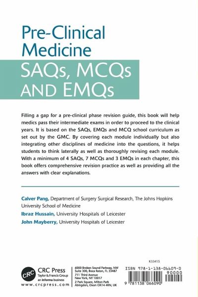 Filling a gap for a pre-clinical revision guide, this book will help medics pass their intermediate exams in order to proceed to the clinical years. It is based on the curriculum as set out by the GMC. With a minimum of 4 SAQs, 7 MCQs and 3 EMQs in each chapter, it provides all the answers with clear explanations.