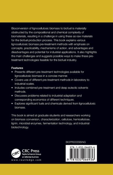 Bioconversion of lignocellulosic biomass to biofuel is materially obstructed by the compositional and chemical complexity of biomaterials, resulting in a challenge in using these as raw materials for the biofuel production process. This book explains various lignocellulosic biomass pre-treatment methods with emphasis on concepts, practicability, mechanisms of action, and advantages and disadvantages and potential for industrial applications. It also highlights the main challenges and suggests possible ways to make these pre-treatment technologies feasible for the biofuel industry. Features Presents different pre-treatment technologies available for lignocellulosic biomass in a concise manner. Covers use of different pre-treatment methods in laboratory to industrial scales. Includes combined pre-treatment and deep eutectic solvents methods. Discusses problems related to industrial adaptation and corresponding economics of different techniques. Explores significant fuels and chemicals derived from lignocellulosic biomass. This book is aimed at graduate students and researchers working on biomass conversion, characterization, cellulose, hemicellulose, lignin, microbial enzymes, fermentation technology, and industrial biotechnology.