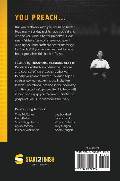 You preach... But you probably wish you could be better. How many Sunday nights have you sat and wished you were a better preacher? How many Friday afternoons have you spent wishing you had crafted a better message for Sunday? You know you'll never be the best preacher in the church, but you sure wish you could be better. You attend seminars, lectureships, conferences, workshops, and summits. You read books and listen to others, but it seems no one ever says, "This is how you do it." How many times have you listened to another preacher and wondered, "How'd he learn to do that?"If you've ever wanted to be a better preacher, this book is for you. Inspired by the Preach Better conference, this book offers the wisdom and counsel of ten preachers who want to help you preach better. Covering topics such as sermon planning, the invitation, lesson illustrations, passion in your delivery, and the preacher's prayer life, this book will inspire and equip you to be a better communicator of the gospel of Jesus Christ.
