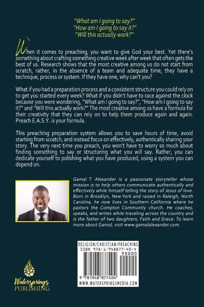 "What am I going to say?" "How am I going to say it?" "Will this actually work?" When it comes to preaching, you want to give God your best. Yet, there's something about crafting something creative week after week that often gets the best of us. Research shows that the most creative among us do not start from scratch, rather in the absence of a team and adequate time, they have a technique, process, or system. If they have one, why can't you? What if you had a preparation process and a consistent structure you could rely on to get you started every week? What if you didn't have to race against the clock because you were wondering, "What am I going to say?", "How am I going to say it?" and "Will this actually work?" The most creative among us have a formula for their creativity that they can rely on to help them produce again and again. Preach E.A.S.Y. is your formula. This preaching preparation system allows you to save hours of time, avoid starting from scratch, and instead focus on effectively, authentically sharing your story. The very next time you preach, you won't have to worry so much about finding something to say or structuring what you will say. Rather, you can dedicate yourself to polishing what you have produced, using a system you can depend on.