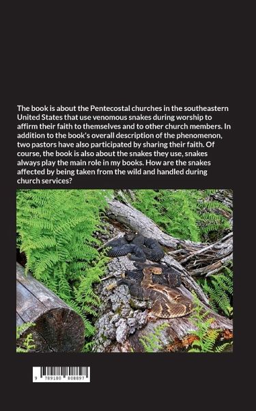The book is about the Pentecostal churches in the southeastern United States that use venomous snakes during worship to affirm their faith to themselves and to other church members. In addition to the book's overall description of the phenomenon, two pastors have also participated by sharing their faith. Of course, the book is also about the snakes they use, snakes always play the main role in my books. How are the snakes affected by being taken from the wild and handled during church services?