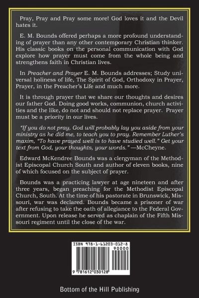 E. M. Bounds offered perhaps a more profound understanding of prayer than any other contemporary Christian thinker. His classic books on the personal communication with God explore how prayer must come from the whole being and strengthens faith in Christian lives. It is through prayer that we share our thoughts and desires our father God. Doing good works, communion, church activities and the like, do not and should not replace prayer. Prayer must be a priority in our lives. If you do not pray, God will probably lay you aside from your ministry as he did me, to teach you to pray. Remember Luther's maxim, "To have prayed well is to have studied well." Get your text from God, your thoughts, your words. -McCheyne. In Preacher and Prayer E. M. Bounds addresses; Study universal holiness of life, The Spirit of God, Orthodoxy in Prayer, Prayer, in the Preacher's Life and much more. Edward McKendree Bounds was a clergyman of the Methodist Episcopal Church South and author of eleven books, nine of which focused on the subject of prayer. Bounds was a practicing lawyer at age nineteen and after three years, began preaching for the Methodist Episcopal Church, South. At the time of his pastorate in Brunswick, Missouri, war was declared. Bounds became a prisoner of war after refusing to take the oath of allegiance to the Federal Government. Upon release he served as chaplain of the Fifth Missouri regiment until the close of the war.