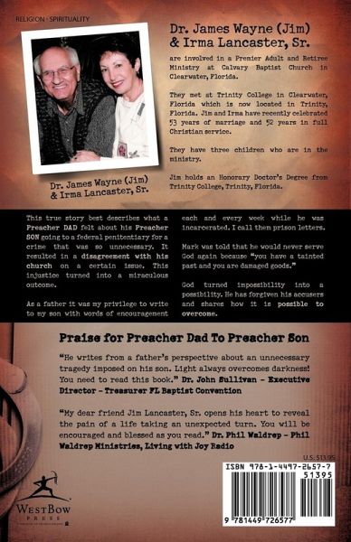 This true story best describes how a preacher dad felt about his preacher son going to a federal penitentiary for a crime that was unnecessary. It resulted in a disagreement with his church on a certain issue. This injustice turned into a miraculous outcome. As a father, it was my privilege to write to my son with words of encouragement every week while he was incarcerated. I call them prison letters. Mark was told [ASI1] that he would never serve God again because "you have a tainted past and you are damaged goods." God turned impossibility into a possibility. He has forgiven his accusers and shares how it is possible to overcome. Praise for Preacher Dad to Preacher Son "He writes from a father's perspective about an unnecessary tragedy imposed on his son. Light always overcomes darkness! You need to read this book." -Dr. John Sullivan, executive director/treasurer, Florida Baptist Convention "Jim Lancaster, Sr. opens his heart to reveal the pain of a life taking an unexpected turn. You will be encouraged and blessed as you read." -Dr. Phil Waldrep, Phil Waldrep Ministries, Living with Joy Radio