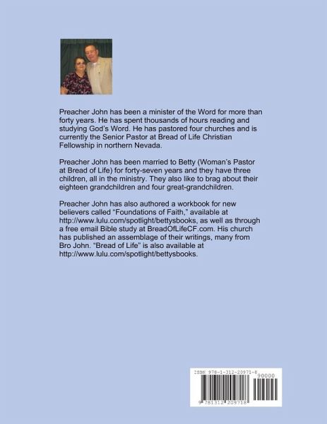 Preacher John has been a minister of the Word for more than forty years. He has spent thousands of hours reading and studying God's Word. He has pastored four churches and is currently the Senior Pastor at Bread of Life Christian Fellowship in northern Nevada. Preacher John has been married to Betty (Woman's Pastor at Bread of Life) for forty-seven years and they have three children, all in the ministry. They also like to brag about their eighteen grandchildren and four great-grandchildren. Preacher John has also authored a workbook for new believers called "Foundations of Faith," available at http://www.lulu.com/spotlight/bettysbooks, as well as through a free email Bible study at BreadOfLifeCF.com. His church has published an assemblage of their writings, many from Bro John. "Bread of Life" is also available at http://www.lulu.com/spotlight/bettysbooks.