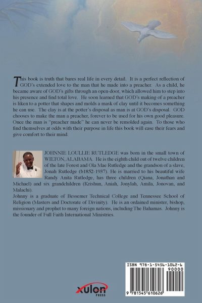 p.p1 {margin: 0.0px 0.0px 0.0px 0.0px; text-align: justify; font: 29.5px 'Albertus Medium'} p.p2 {margin: 0.0px 0.0px 0.0px 0.0px; text-align: justify; font: 11.0px Times} This book is truth that bares real life in every detail. It is a perfect reflection of GOD's extended love to the man that he made into a preacher. As a child, he became aware of GOD's gifts through an open-door, which allowed him to step into his presence and find total love. He soon learned that GOD's making of a preacher is liken to a potter that shapes and molds a mask of clay until it becomes something he can use. The clay is at the potter's disposal as man is at GOD's disposal. GOD chooses to make the man a preacher, forever to be used for his own good pleasure. Once the man is "preacher made" he can never be remolded again. To those who find themselves at odds with their purpose in life this book will ease their fears and give comfort to their mind. p.p1 {margin: 0.0px 0.0px 0.0px 0.0px; text-align: justify; font: 11.0px Times} JOHNNIE LOULLIE RUTLEDGE was born in the small town of WILTON, ALABAMA. He is the eighth child out of twelve children of the late Forest and Ola Mae Rutledge and the grandson of a slave, Jonah Rutledge (b1852-1937). He is married to his beautiful wife Randy Anita Rutledge, has three children (Qiana, Jonathan and Michael) and six grandchildren (Krishun, Aniah, Jonylah, Amila, Jonovan, and Malachi). Johnny is a graduate of Bessemer Technical College and Tennessee School of Religion (Masters and Doctorate of Divinity). He is an ordained minister, bishop, missionary and prophet to many foreign nations, including The Bahamas. Johnny is the founder of Full Faith International Ministries.