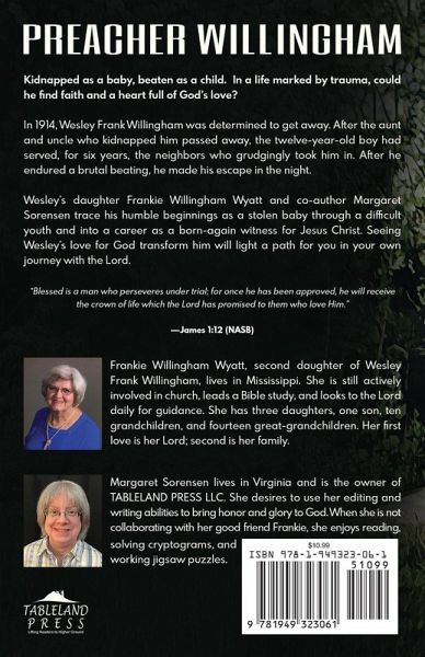 Kidnapped as a baby, beaten as a child. In a life marked by trauma, could he find faith and a heart full of God's love? Previously published as Old Man Preacher Willingham In 1914, Wesley Frank Willingham was determined to get away. After the aunt and uncle who kidnapped him passed away, the twelve-year-old boy had served, for six years, the neighbors who grudgingly took him in. Wesley had been regularly abused, given scraps to eat, and forced to do chores barefooted, even in freezing weather. After he endured a brutal beating, he made his escape in the night. In a deep dive into a man who overcame hardship and abuse, his daughter Frankie Willingham Wyatt and co-author Margaret Sorensen trace his humble beginnings as a stolen baby through a difficult youth and into a career as a born-again witness for Jesus Christ. Seeing Wesley's love for God transform him and experiencing his testimony of hope and purpose will light a path for readers in their own journey with the Lord. Written as an endearing memorial, this moving Christian biography has been updated with a new introduction and more family photos. If you like real-life stories and inspirational accounts with spiritual role models, then you'll adore this heartwarming tale of redemption and faith.