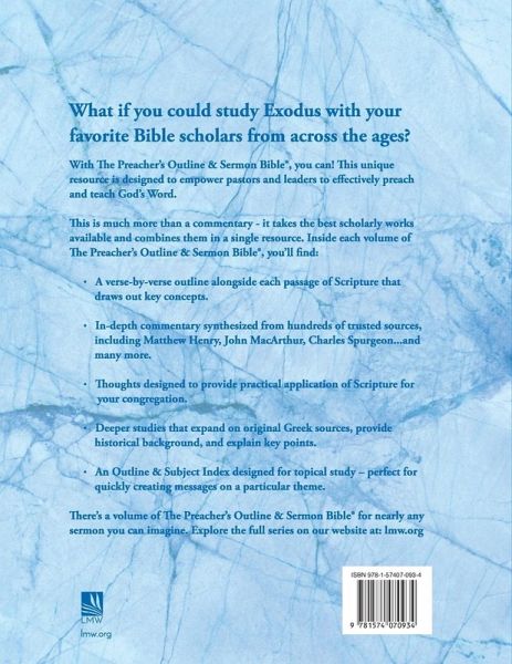 What if you could study Exodus with your favorite Bible scholars from across the ages? With The Preacher's Outline & Sermon Bible, you can! This volume contains chapters 1-18 of Exodus. This unique resource is designed to empower pastors and leaders to effectively preach and teach God's Word. This is much more than a commentary - it takes the best scholarly works available and combines them in a single resource. Inside each volume of The Preacher's Outline & Sermon Bible, you'll find: - A verse-by-verse outline alongside each passage of Scripture that draws out key concepts. - In-depth commentary synthesized from hundreds of trusted sources, including Matthew Henry, John MacArthur, Charles Spurgeon...and many more. - Thoughts designed to provide practical application of Scripture for your congregation. - Deeper studies that expand on original Greek sources, provide historical background, and explain key points. - An Outline & Subject Index designed for topical study - perfect for quickly creating messages on a particular theme. There's a volume of The Preacher's Outline & Sermon Bible series for nearly any sermon you can imagine. This volume covers Exodus chapters 1-18. Explore the full series on our website at store.lmw.org