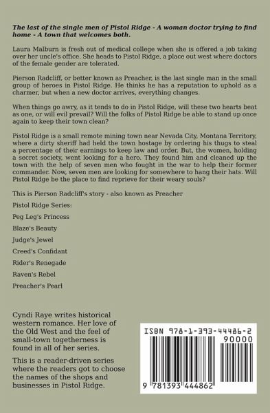 The last of the single men of Pistol Ridge - A woman doctor trying to find home - A town that welcomes both. Laura Malburn is fresh out of medical college when she is offered a job taking over her uncle's office. She heads to Pistol Ridge, a place out west where doctors of the female gender are tolerated. Pierson Radcliff, or better known as Preacher, is the last single man in the small group of heroes in Pistol Ridge. He thinks he has a reputation to uphold as a charmer, but when a new doctor arrives, everything changes. When things go awry, as it tends to do in Pistol Ridge, will these two hearts beat as one, or will evil prevail? Will the folks of Pistol Ridge be able to stand up once again to keep their town clean? Pistol Ridge is a small remote mining town near Nevada City, Montana Territory, where a dirty sheriff had held the town hostage by ordering his thugs to steal a percentage of their earnings to keep law and order. But, the women, holding a secret society, went looking for a hero. They found him and cleaned up the town with the help of seven men who fought in the war to help their former commander. Now, seven men are looking for somewhere to hang their hats. Will Pistol Ridge be the place to find reprieve for their weary souls? This is Pierson Radcliff's story - also known as Preacher
