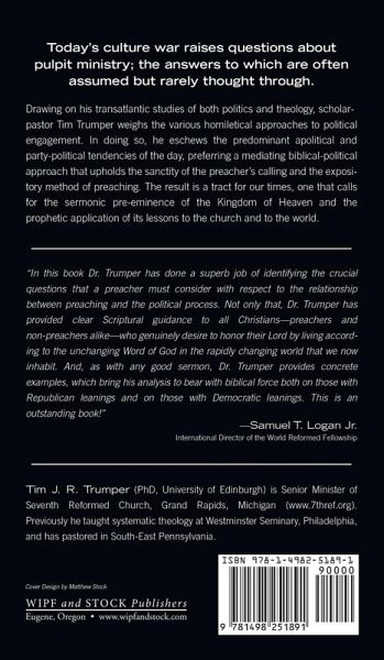 Today's culture war raises questions about pulpit ministry; the answers to which are often assumed but rarely thought through. Drawing on his transatlantic studies of both politics and theology, scholar-pastor Tim Trumper weighs the various homiletical approaches to political engagement. In doing so, he eschews the predominant apolitical and party-political tendencies of the day, preferring a mediating biblical-political approach that upholds the sanctity of the preacher's calling and the expository method of preaching. The result is a tract for our times, one that calls for the sermonic pre-eminence of the Kingdom of Heaven and the prophetic application of its lessons to the church and to the world.